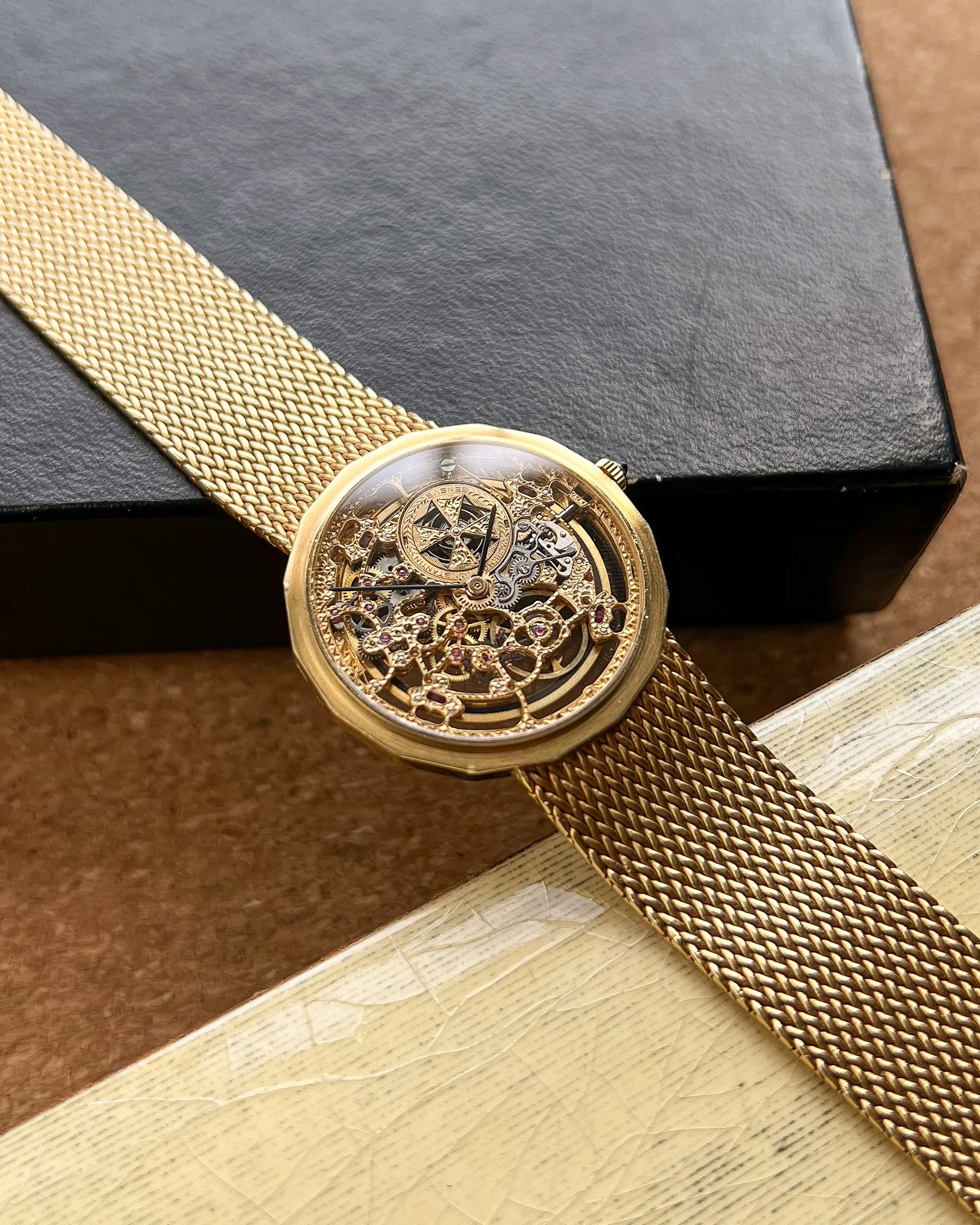 What I love — Rare and beautiful, fully hand engraved skeletonized VC powered by the automatic JLC 920 ébauche. Complete set including the original receipt from the Manchester Watches of Switzerland in 1990. The case is in good condition, rather delightful 16 sided case with hallmarks present on the side. This bracelet variant is very uncommon, the first I’ve seen and will fit up to 19cm. The watch has just had a full mechanical service and ready to roll!