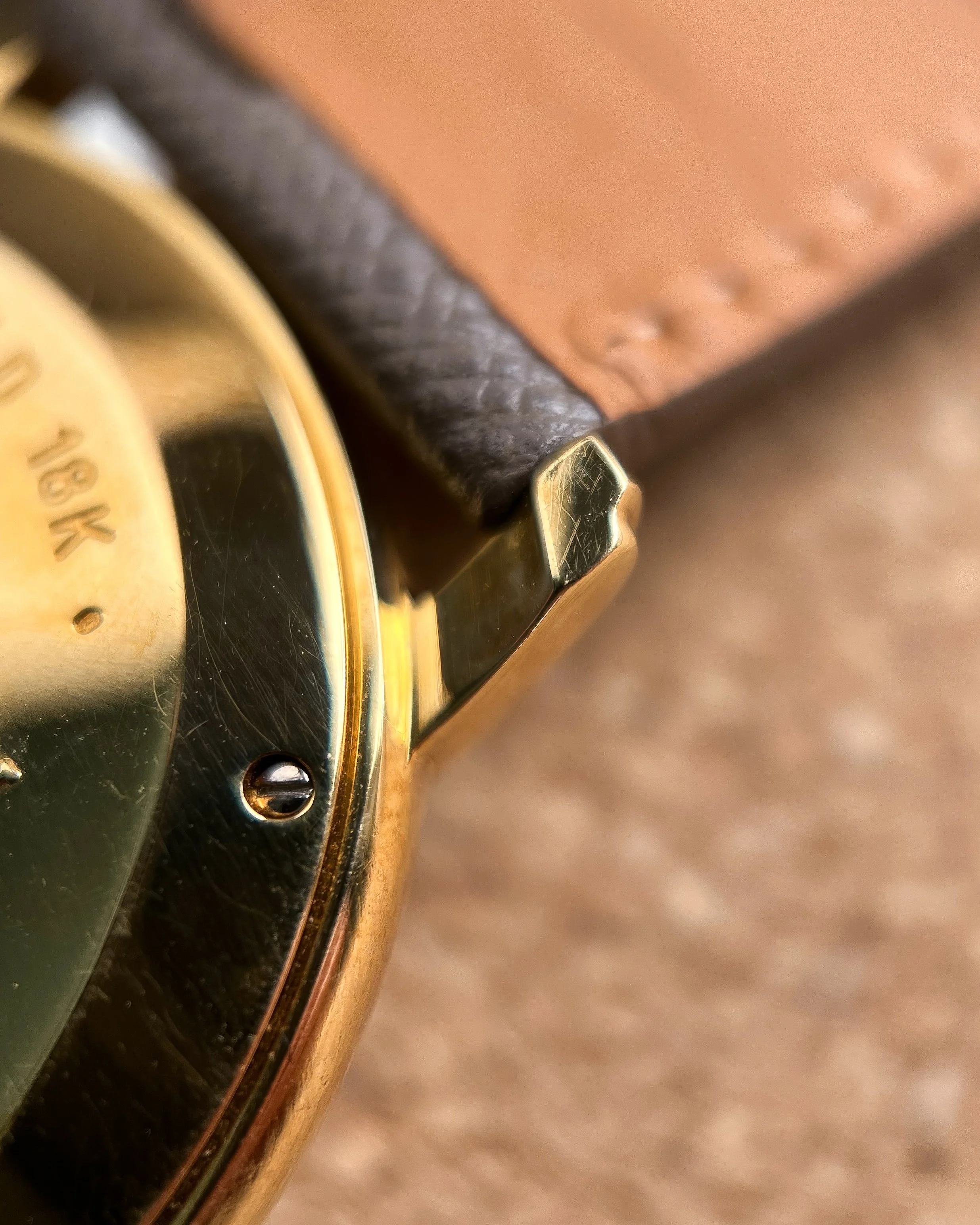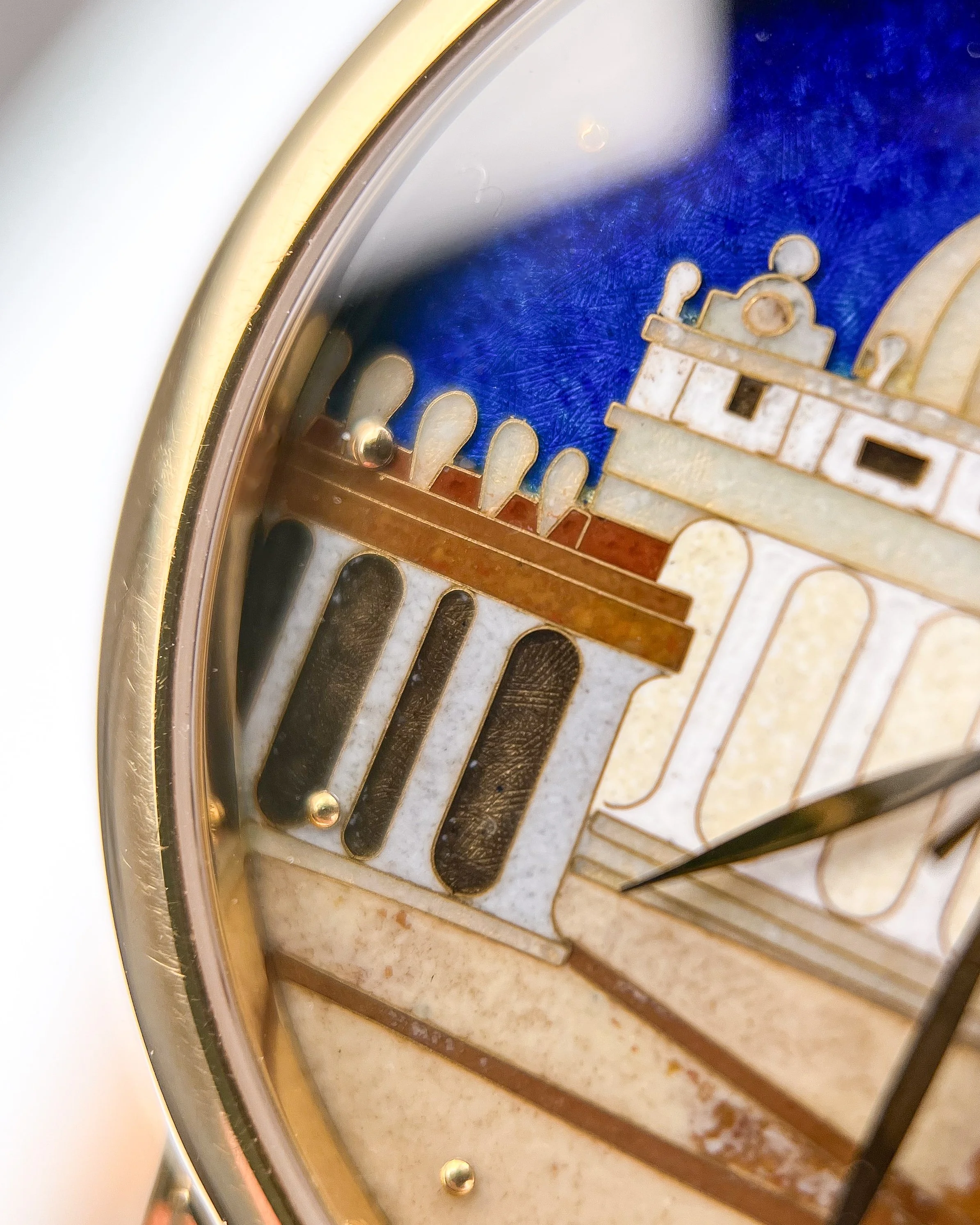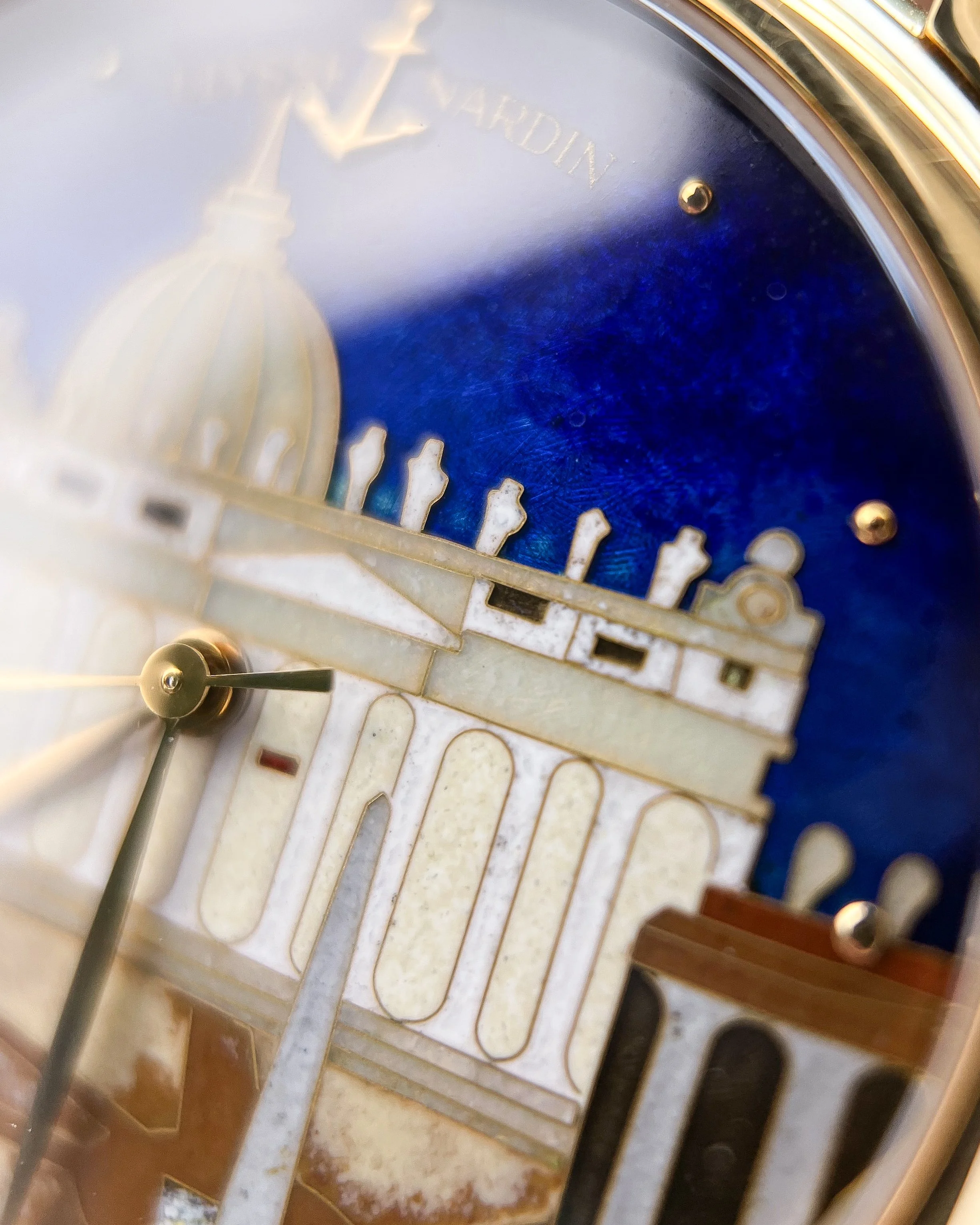 What I love — Beautiful and detailed enamel dial depicting Piazza San Pietro in Rome. The dial is in perfect condition as are the hands. The case is in great shape, case back details crisp and stepped lugs well defined. The original UN 18k yellow gold pin buckle is present and the case measures a very wearable 37mm. It’s no secret that I’m a huge fan of these high craft Nardin enamel watches, each one brings something a little different to the wrist!