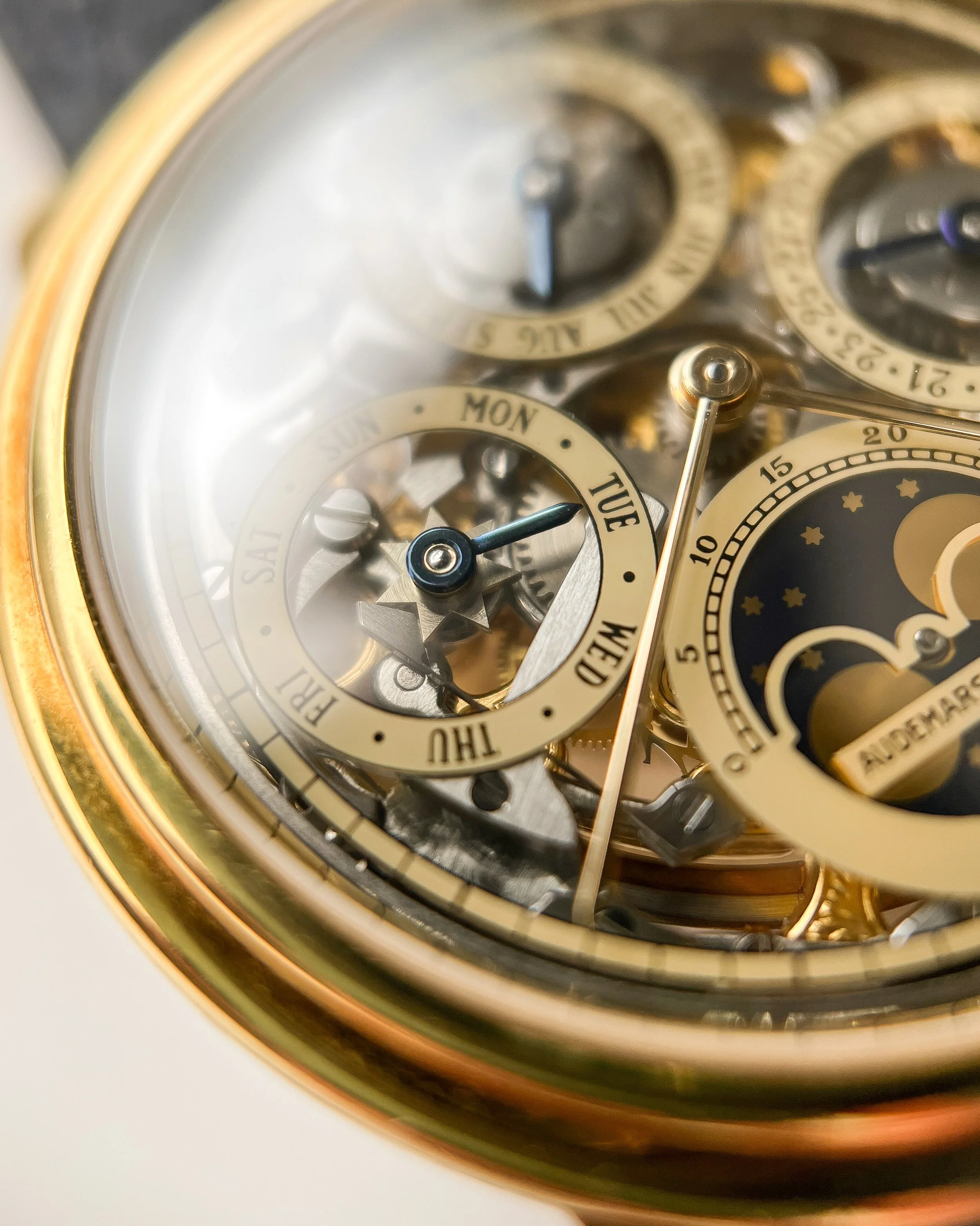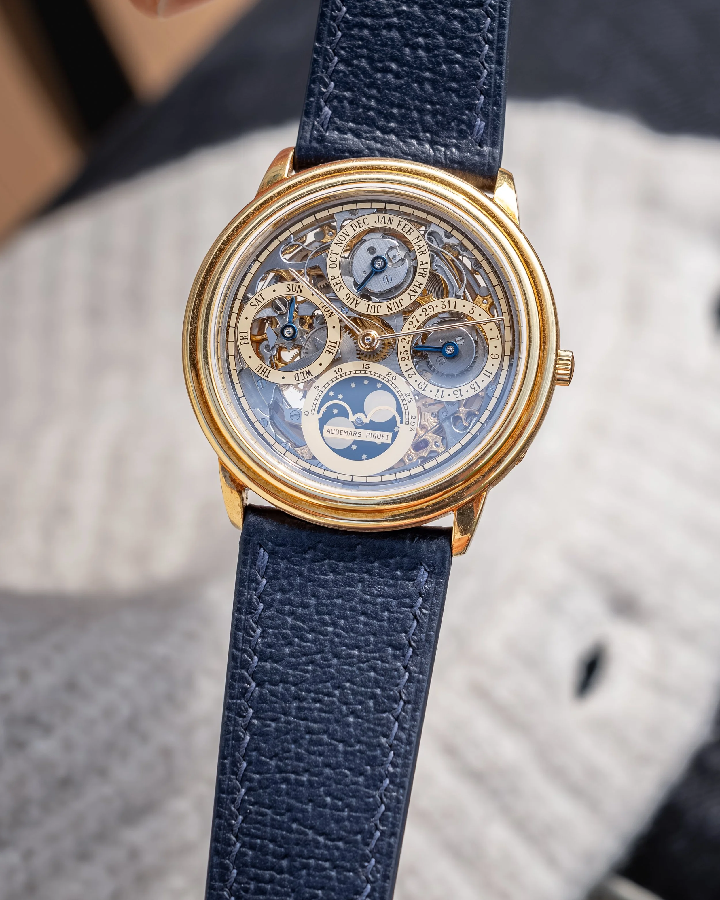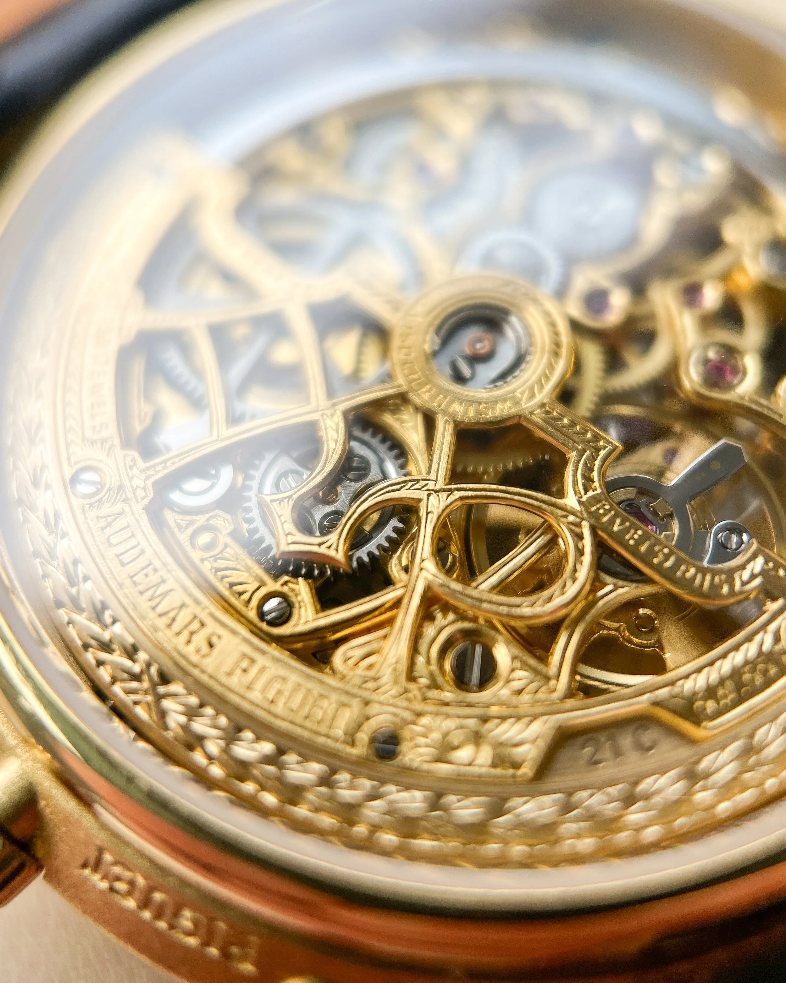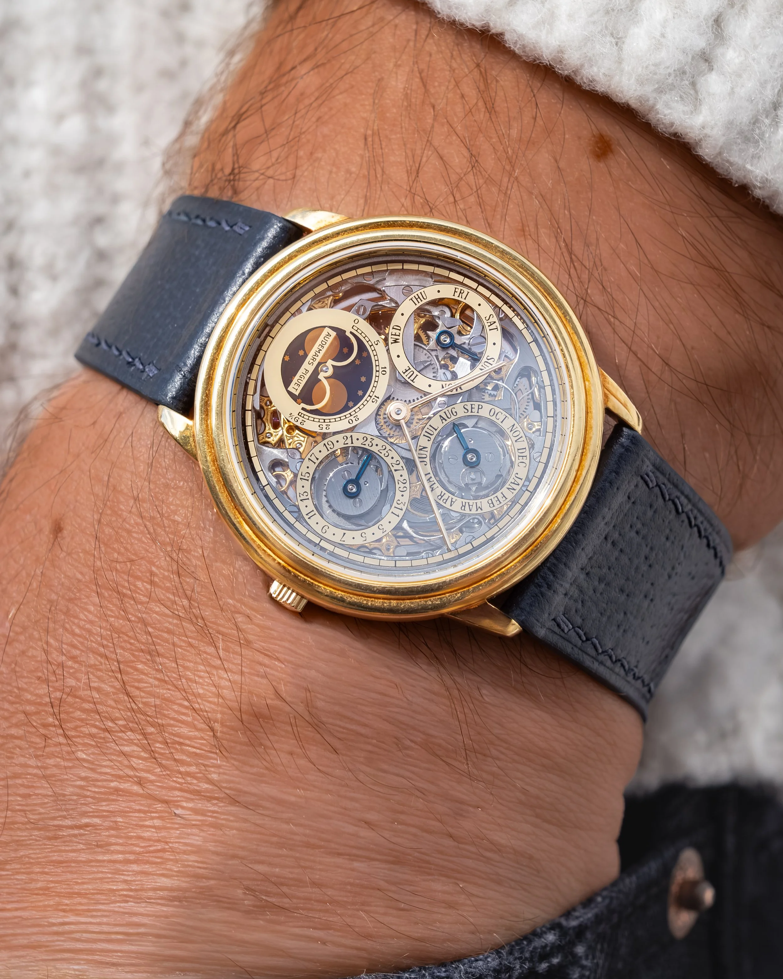 What I love — Exceptional brushed and polished finish platinum case with display back. The rose gold hand-engraved 2121 is a major draw creating a wonderful high-low with the rather unassuming white sector dial at the front. The case is preserved perfectly with engravings deep and no.42 on the back, limited run. The dial is beautifully simple with EXTRA PLAT at 6. The watch comes with it original platinum buckle.