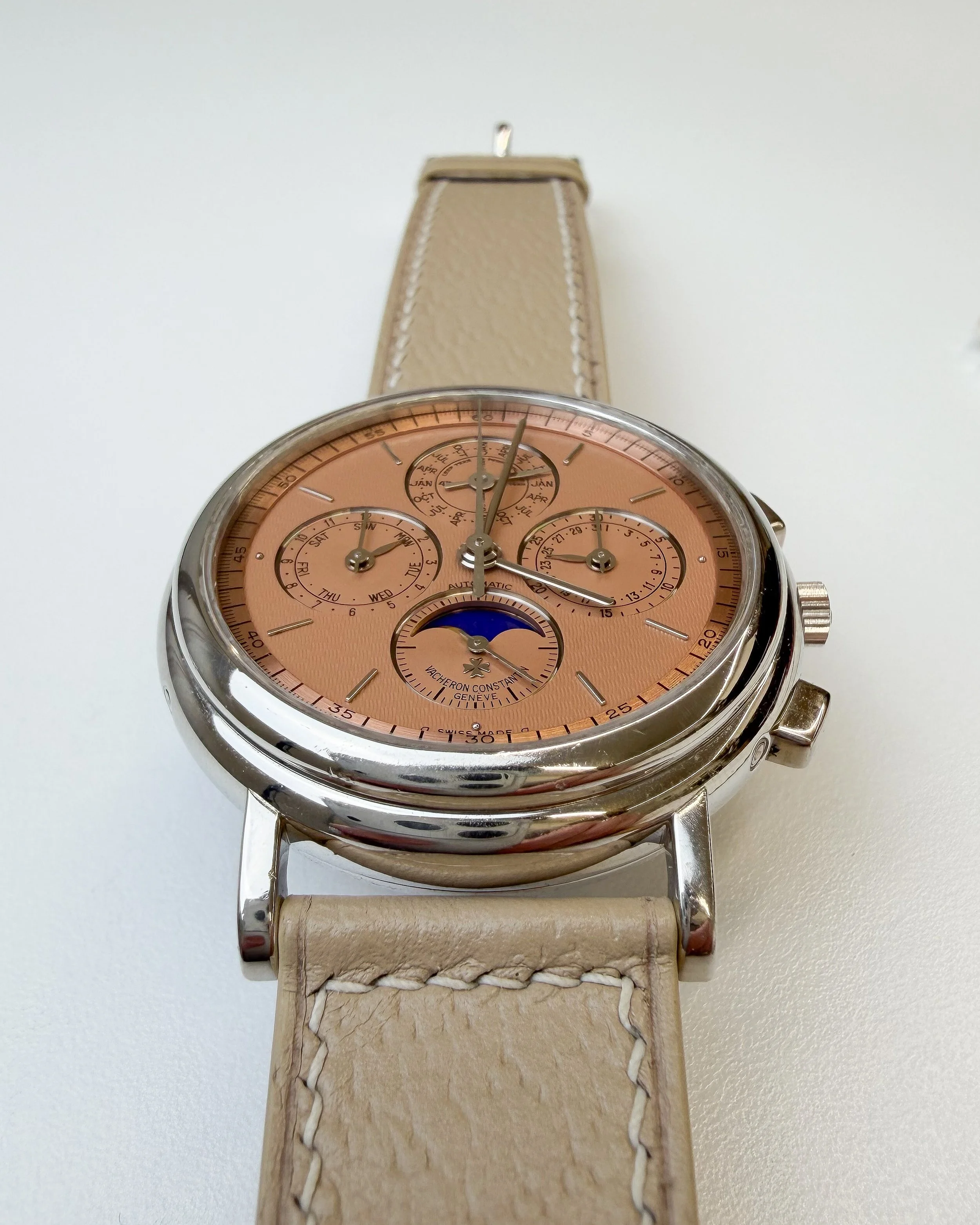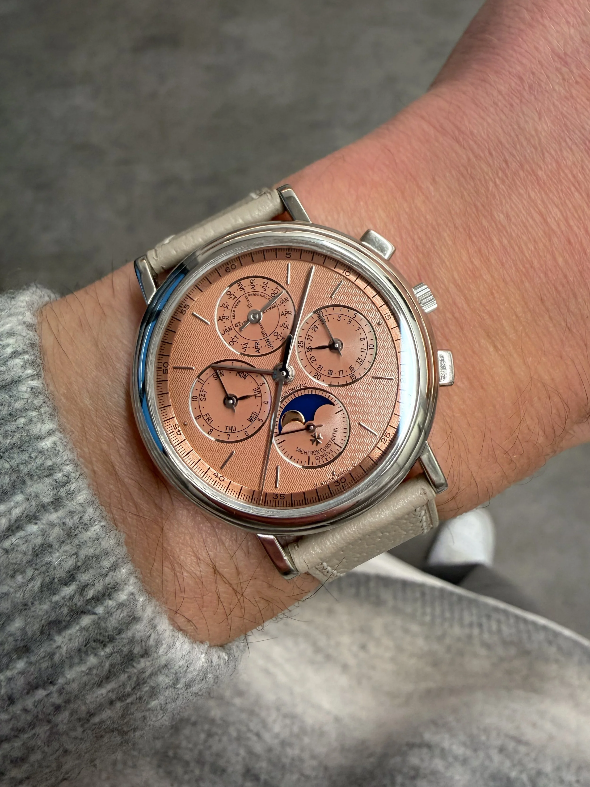 What We love — An early example of the ref. 765 with pink gold hands and indices. The raised enamel signature is still beautifully sharp, the guilloché is preserved wonderfully and the multi-stepped reeded bezel still crisp. This is very much a beautiful object as it is a watch. The case is signed Geneva Key No. 5, the poinçon de maître for Georges Croisier, the long-established Geneva casemaker whose work appears for houses like Patek Philippe and Vacheron Constantin. Under 10 examples of this config have shown up in auction to date.